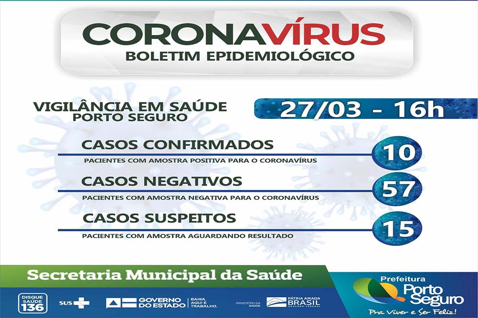 A Prefeitura de Porto Seguro, em ação integrada a Secretaria de Saúde, emite oficialmente nesta sexta-feira, 27/03, às 16h, Boletim Epidemiológico atualizado sobre os casos confirmados, negativos e suspeitos, com o objetivo de manter informada a população sobre os casos de Coronavírus.