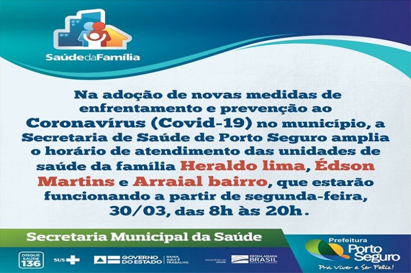 Na adoção de novas medidas de enfrentamento e prevenção ao Coronavírus (Covid-19) no município, a Secretaria de Saúde de Porto Seguro decide ampliar o horário de atendimento das unidades de saúde da família Heraldo lima, Édson Martins e Arraial bairro, que estarão funcionando a partir de segunda-feira, 30/03, das 8h às 20h.