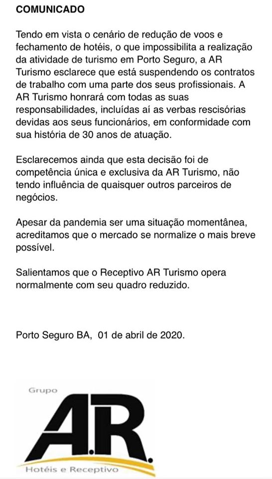 A decisão da AR Turismo de rescindir o contrato com parte de seus colaboradores foi motivada pela suspensão temporária de operações de viagens por parte de hotéis, companhias aéreas e serviços de turismo. A AR Turismo efetuará o pagamento de verbas rescisórias e acredita que, tão logo a situação seja normalizada, abrirá postos de trabalho novamente.