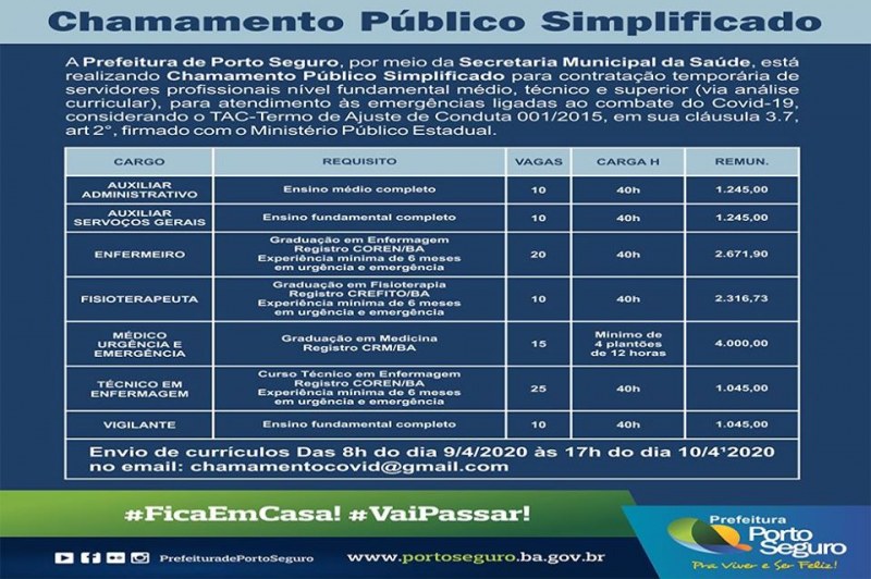 Atenção! Por uma falha crítica no provedor do site da Prefeitura de Porto Seguro, os interessados que já haviam enviado currículos para o email corporativo descrito no edital, favor reenviar para o email: chamamentocovid@gmail.com