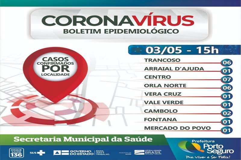 A Prefeitura de Porto Seguro, em ação integrada a Secretaria de Saúde, emite oficialmente neste domingo, 03/05, às 15h, Boletim Epidemiológico atualizado sobre os casos confirmados, descartados, aguardando resultado de exame, síndrome gripal e internados, com o objetivo de manter informada a população sobre os casos de coronavírus.