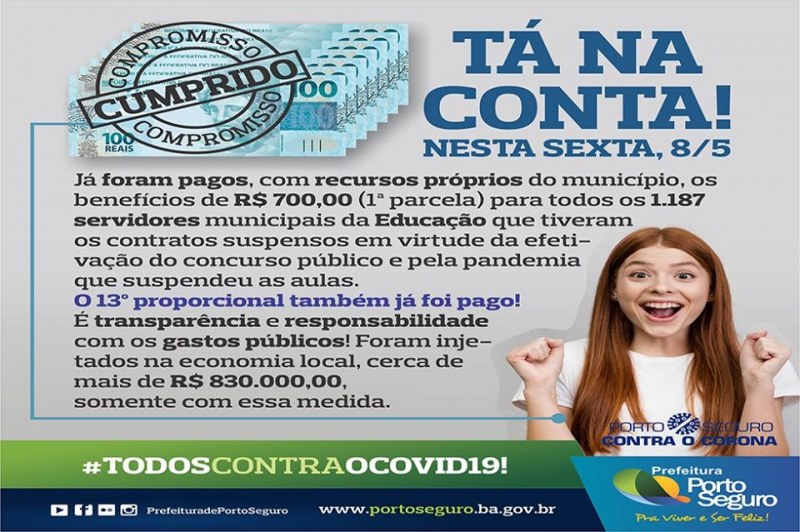 A Prefeitura de Porto Seguro está pagando um auxílio emergencial aos servidores contratados da Educação que tiveram contratos suspensos por conta da interrupção das atividades escolares provocada pela pandemia do novo coronavírus. Mesmo com a considerável queda na arrecadação municipal, a gestão está fazendo um grande esforço para garantir um apoio a essas famílias neste momento de crise.