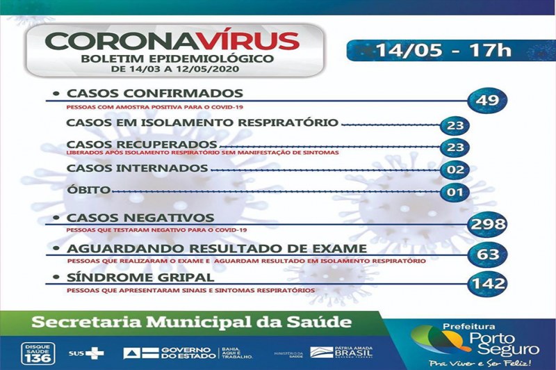A Prefeitura de Porto Seguro, em ação integrada a Secretaria de Saúde, emite oficialmente nesta quinta-feira, 14/05, às 17h, aponta mais um Boletim Epidemiológico com mais um caso positivo de Covid-19. Agora com 49 casos, o boletim faz atualização sobre os casos confirmados, descartados, aguardando resultado de exame, síndrome gripal e internados, com o objetivo de manter informada a população sobre os casos de coronavírus.