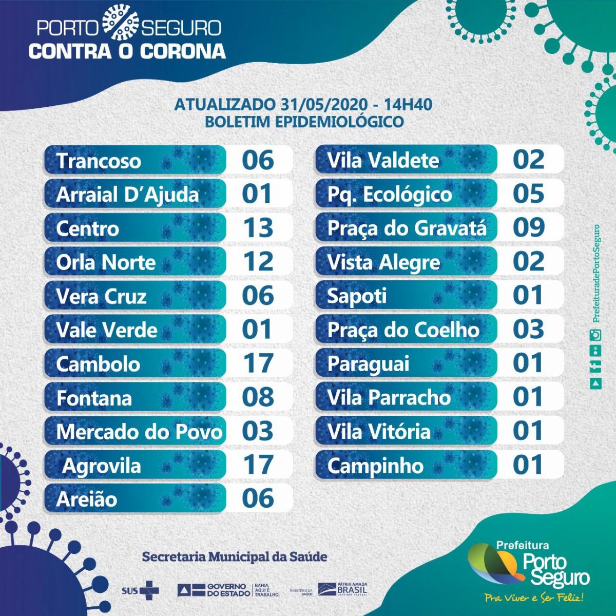 A Prefeitura de Porto Seguro, em ação integrada a Secretaria de Saúde, emite oficialmente neste sábado, 31/05, às 14h40, novo Boletim Epidemiológico, que após recebimento de 06 resultados positivos, a cidade passa a ter 116 casos confirmados da covid-19. O boletim destaca as seguintes informações; 39 pacientes curados; 70 pacientes ativos em isolamento domiciliar; 06 pacientes ativos em internamento hospitalar e 01 óbito.