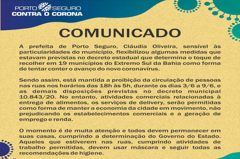 A prefeita de Porto Seguro, Cláudia Oliveira, sensível às particularidades do município, flexibilizou algumas medidas que estavam previstas no decreto estadual que determina o toque de recolher em 19 municípios do Extremo Sul da Bahia como forma de tentar conter o avanço do novo coronavírus.