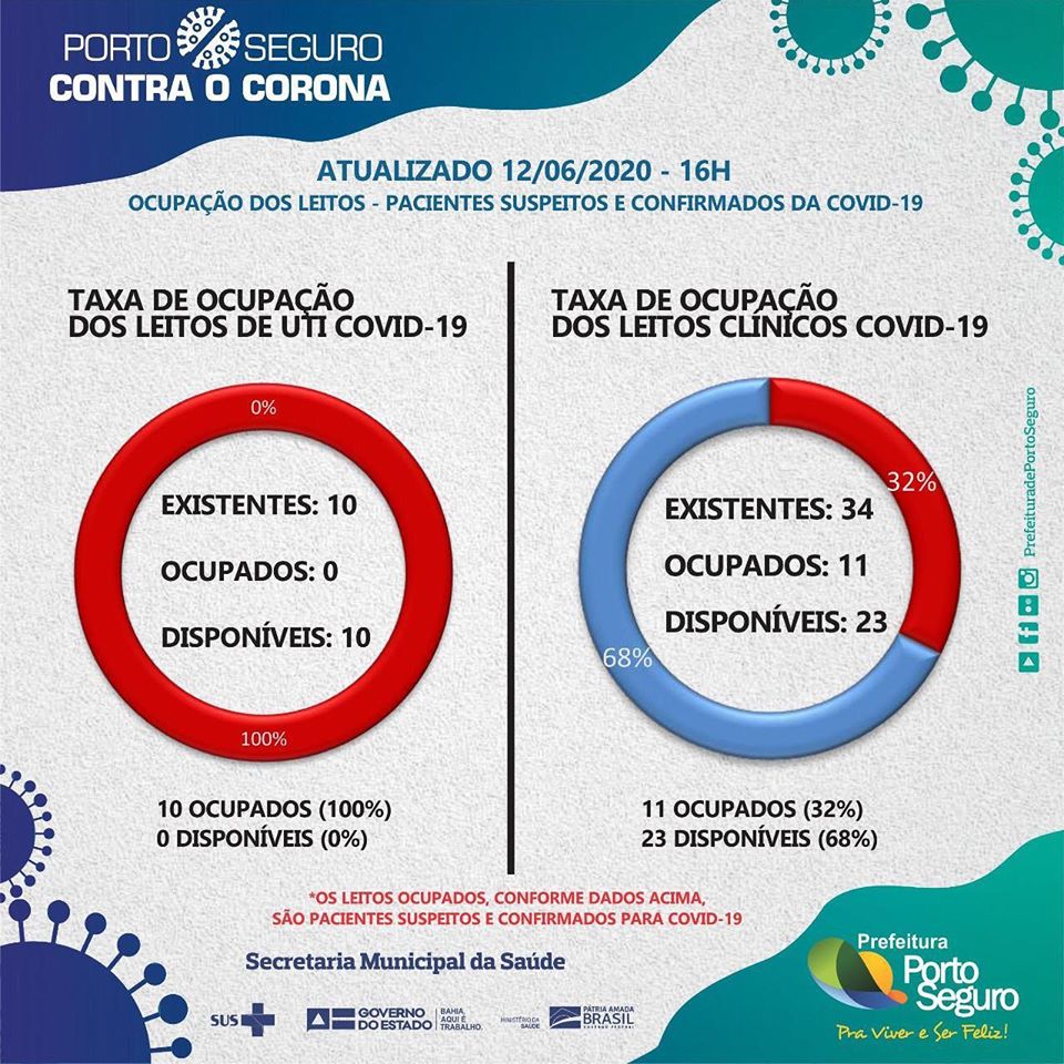 Porto Seguro apresenta um quadro de 269 casos positivos, dos quais 92 pessoas estão curadas; 168 paxientes em quarentena domiciliar; 06 pacientes internados; 13 pessoas aguardando resultado de exames e 03 óbitos. A Secretaria dMunicipal de Saúde segue monitorando 290 pacientes com sindrome gripal.