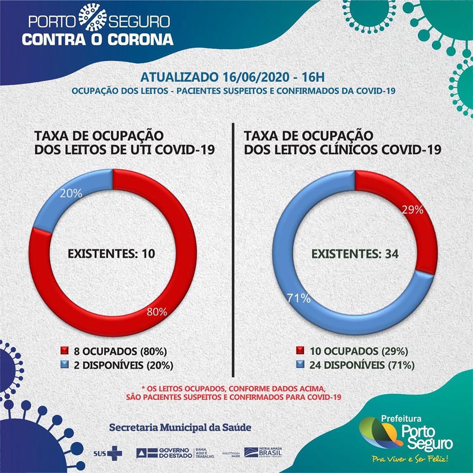 Porto Seguro apresenta um quadro de 300 casos positivos, dos quais 137 pessoas estão curadas; 151 paxientes em quarentena domiciliar; 09 pacientes internados; 13 pessoas aguardando resultado de exames e 03 óbitos. A Secretaria Municipal de Saúde segue monitorando 300 pacientes com sindrome gripal.