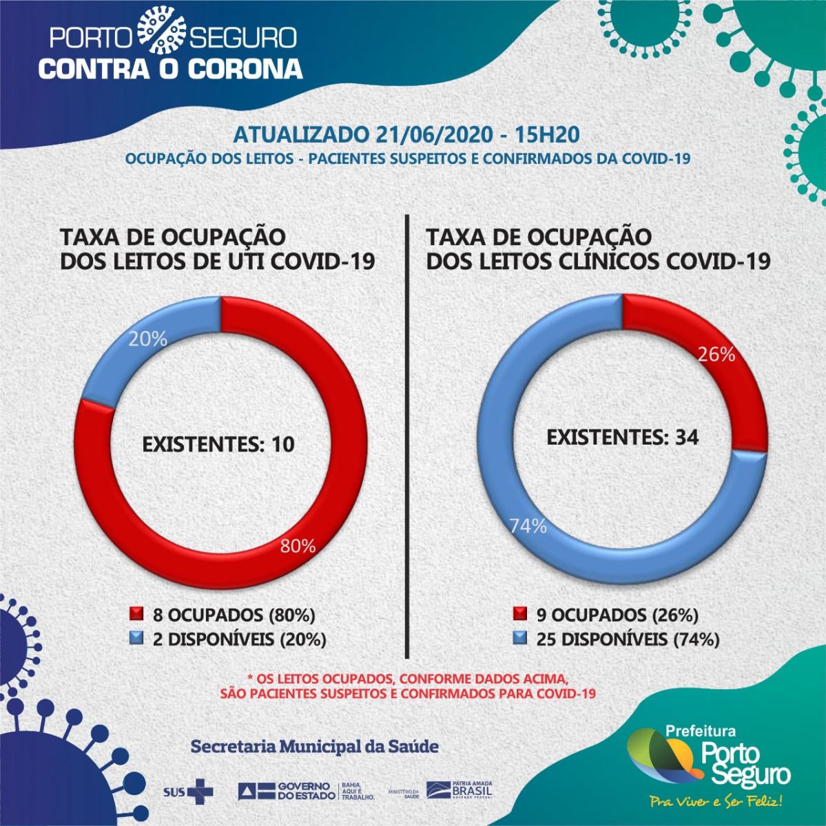 A Prefeitura de Porto Seguro, em ação integrada a Secretaria de Saúde, emite oficialmente no último domingo, 21/06, às 15:20, Boletim Epidemiológico atualizado sobre os casos confirmados, descartados, aguardando resultado de exame, síndrome gripal e internados, com o objetivo de manter informada a população sobre os casos de coronavírus.