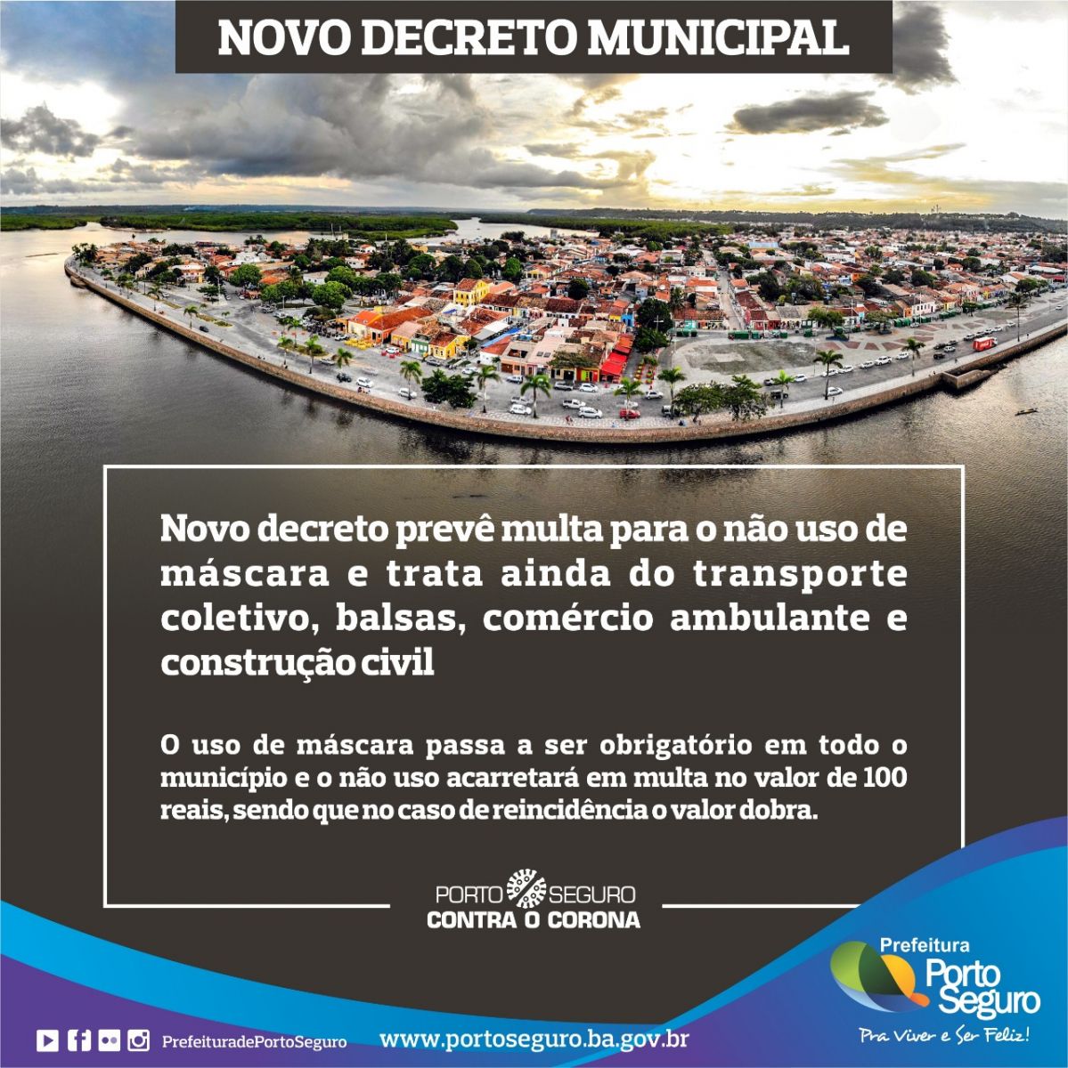 O uso de máscara passa a ser obrigatório em todo o município e o não uso acarretará em multa no valor de 100 reais, sendo que no caso de reincidência o valor dobra. Para os supermercados e congêneres, o horário de funcionamento é das 7 às 20 horas, de segunda a sábado, podendo reabrir aos domingos.