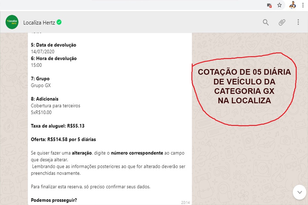 Seguindo estas dicas, obtivemos uma cotação com o valor de R$ 514,78 por cinco diárias referente à categoria GX, que na definição da empresa, está o veículo Jeep Renegade Sport 1.8 ou similar. Entretanto, para minha surpresa ao tentar fazer o aluguel do veículo pela promoção, o atendente me passou o valor de R$ 739,26.