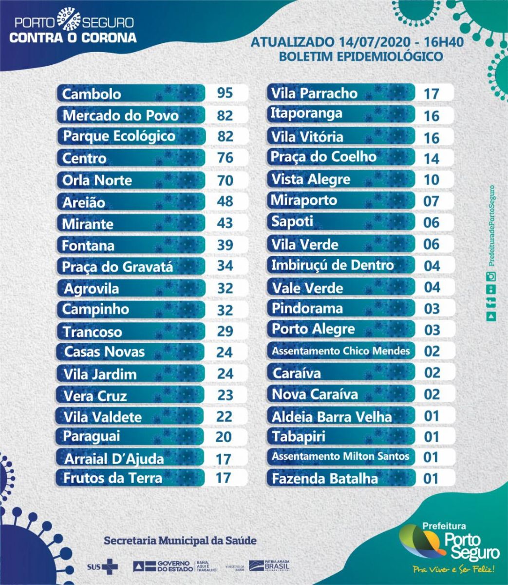 A Prefeitura de Porto Seguro, em ação integrada a Secretaria de Saúde, emite oficialmente nesta segunda-feira 14/07, às 16:40, Boletim Epidemiológico atualizado sobre os casos confirmados, descartados, aguardando resultado de exame, síndrome gripal e internados, com o objetivo de manter informada a população sobre os casos de coronavírus.