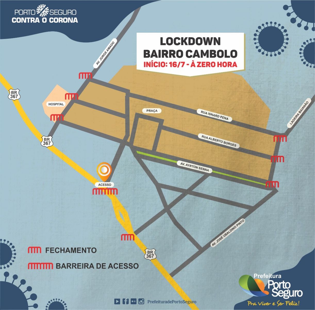 A Prefeitura de Porto Seguro anunciou, na tarde desta terça-feira (14), que adotará medidas restritivas regionalizadas e ações de proteção à vida e à saúde com regime de lockdown no Cambolo, em face no alto índice e crescimento da contaminação do coronavírus no bairro. O fechamento inicia-se à zero hora do dia 16 de julho e vai até o dia 20 do mesmo mês.
