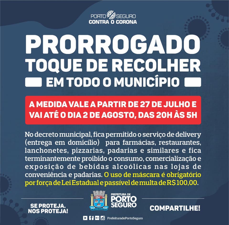 A prefeita Cláudia Oliveira assinou, hoje, 27 de julho, um novo decreto prorrogando, até o dia 2 de agosto, às 23h59, o toque de recolher, entre 20h e 5h, ficando terminantemente proibida a circulação e permanência de pessoas nos parques, praças, ruas e logradouros públicos, A medida, que foi instituída em julho e prorrogada no último dia 14, vigorou até este domingo, 26.