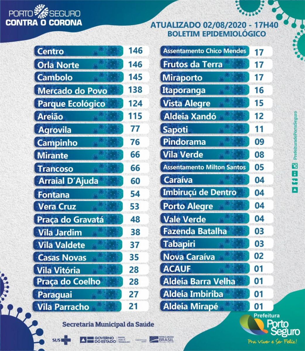 Porto Seguro apresenta um quadro de 1.683 casos positivos, dos quais 1.291 pessoas estão curadas; 347 pacientes em quarentena domiciliar; 21 pacientes internados; 41 pessoas aguardando resultado de exames e 24 óbitos. A Secretaria Municipal de Saúde segue monitorando 1.433 pacientes com sindrome gripal.