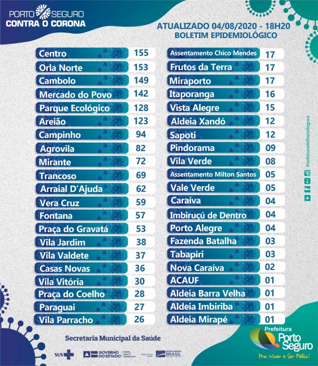 A Prefeitura de Porto Seguro, em ação integrada a Secretaria de Saúde, emite oficialmente nesta terça-feira 04/08, às 18:20, Boletim Epidemiológico atualizado sobre os casos confirmados, descartados, aguardando resultado de exame, síndrome gripal e internados, com o objetivo de manter informada a população sobre os casos de coronavírus.