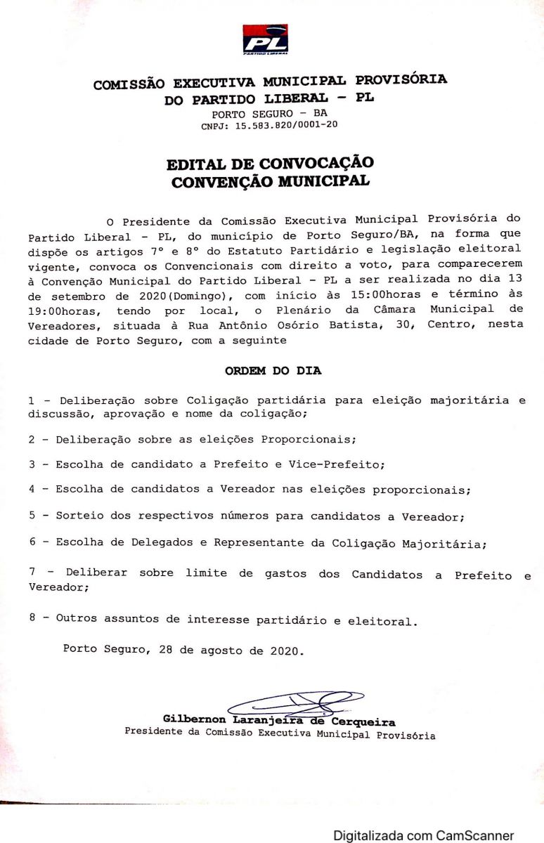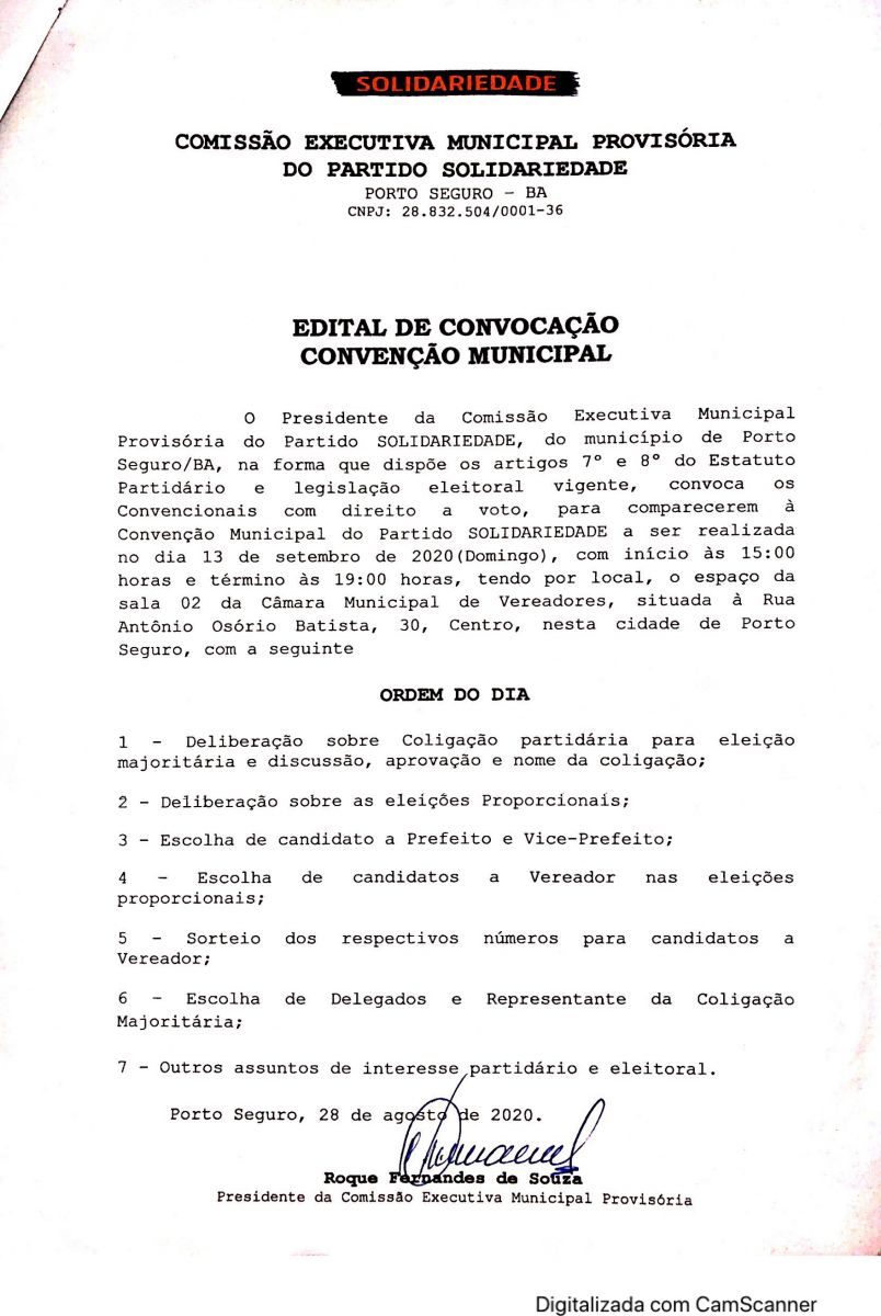 A convenção dos referidos partidos será realizada no domingo 13/09, no Plenário da Câmara Municipal de Porto Seguro das 13:00 às 19:00. Veja abaixo os editais de convocação de cada partido, bem como o rito a ser seguido durantes a convenção.