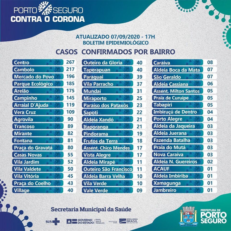 Porto Seguro apresenta um quadro de 2.613 casos positivos, dos quais 2.230 pessoas estão curadas; 323 pacientes em quarentena domiciliar; 10 pacientes internados; 18 pessoas aguardando resultado de exames e 50 óbitos. A Secretaria Municipal de Saúde segue monitorando 3.857 pacientes com sindrome gripal.