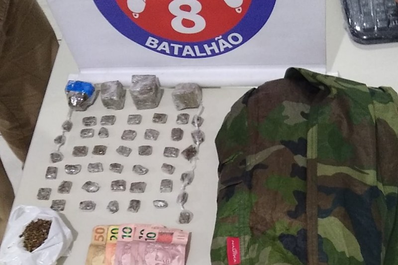 No interior da casa, localizada na Rua dos Sabiás, foram encontrados 41 papelotes, 04 pedaços prensados e mais 01 porção de maconha, 01 relógio dourado, 01 blusão camuflado e R$ 100,00 em espécie.