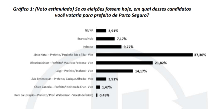 Jânio Natal e Paulinho Tôa Tôa ampliam vantagem na reta final das eleições e chegam a 15,5 pontos de vantagem para o segundo colocado. A Pesquisa Registrada sob o N° 01638/2020 aponta o seguinte quadro; Jânio/Paulinho com 37,30%; Udurico/Maurício 21,82%; Luiggi Rotunno aparece com 14,27%; Lívia Bittencourt 3,91; Chico Cancela 1,47% e Roni da Lotação com 0,49% das intenções de votos.