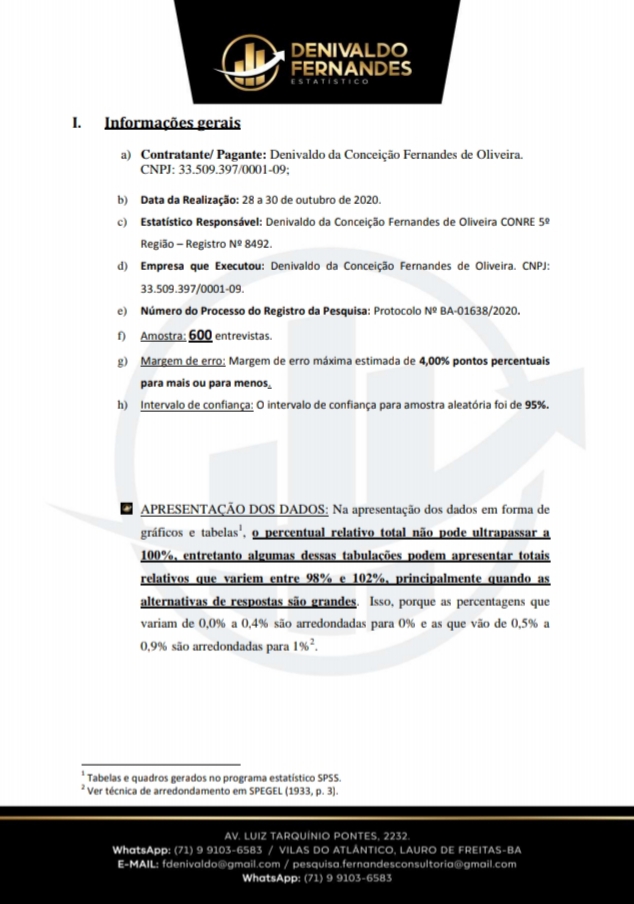 O Juiz Eleitoral Dr° Rafael Biqueira Montouro (122° Zona Eleitoral), autorizou a divulgação de pesquisa eleitoral em Porto Seguro, a qual foi Registrada no TSE - Tribunal Superior Eleitoral sob o N° 01638/2020. Realizada pela empresa Denivaldo Fernandes, CNPJ: 33.509.397/0001/09, a pesquisa entrevistou 600 eleitores entre os dias 28 e 30 de outubro de 2020, a margem de erro é de 4 pontos percentuais para mais ou para menos e possui 95% confiança.