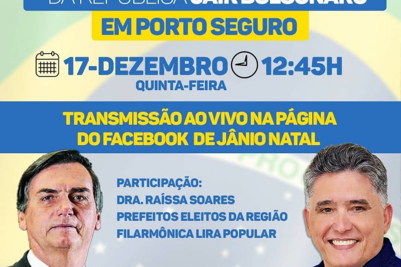 O encontro entre Jânio Natal e Jair Bolsonaro será transmitido em live na página do Facebook do futuro prefeito de Porto Seguro às 12:45H. O encontro também contará com a presença do Ministro de Desenvolvimento Regional, Rogério Marinho. Empresários e lideranças políticas de Porto Seguro também já confirmaram presença no encontro.