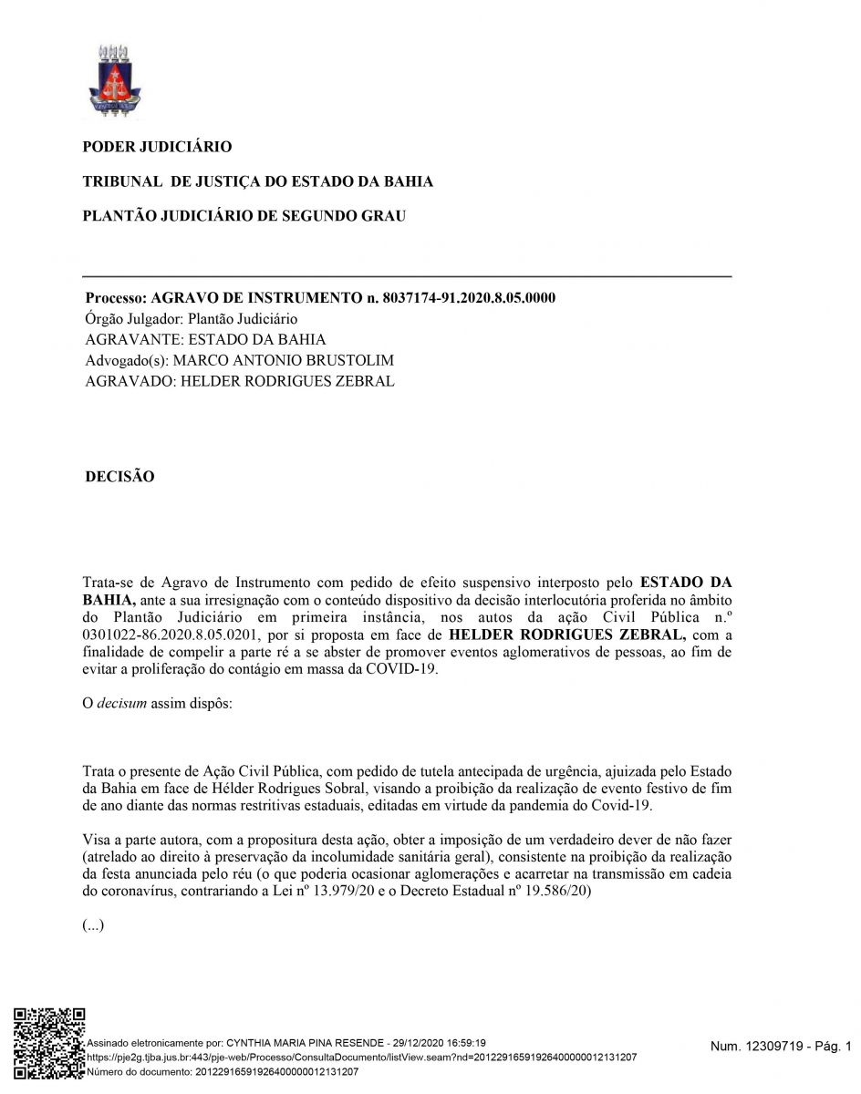 Na tentativa de proibir qualquer tipo de evento,o governador Rui Costa entrou com uma Ação Civil Pública, com pedido de tutela antecipada de urgência, ajuizada pelo Estado da Bahia em face de Hélder Rodrigues Sobral, visando a proibição da realização de evento festivo de fim de ano diante das normas restritivas estaduais, editadas em virtude da pandemia do Covid-19. Visa a parte autora, com a propositura desta ação, obter a imposição de um verdadeiro dever de não fazer (atrelado ao direito à preservação da incolumidade sanitária geral), consistente na proibição da realização da festa anunciada pelo réu (o que poderia ocasionar aglomerações e acarretar na transmissão em cadeia do coronavírus, contrariando a Lei nº 13.979/20 e o Decreto Estadual nº 19.586/20).