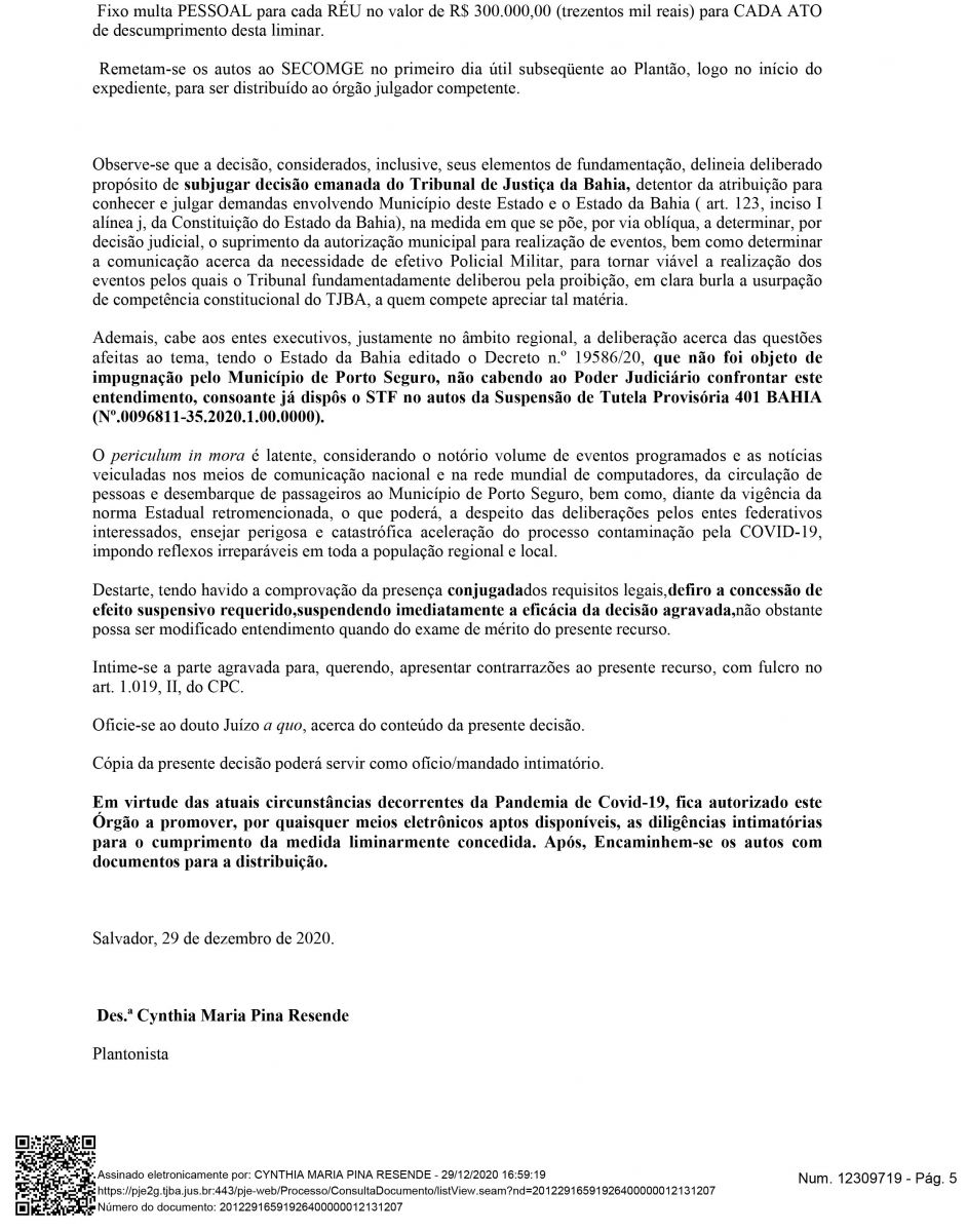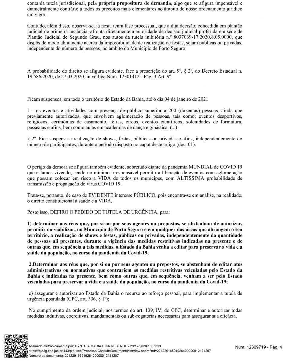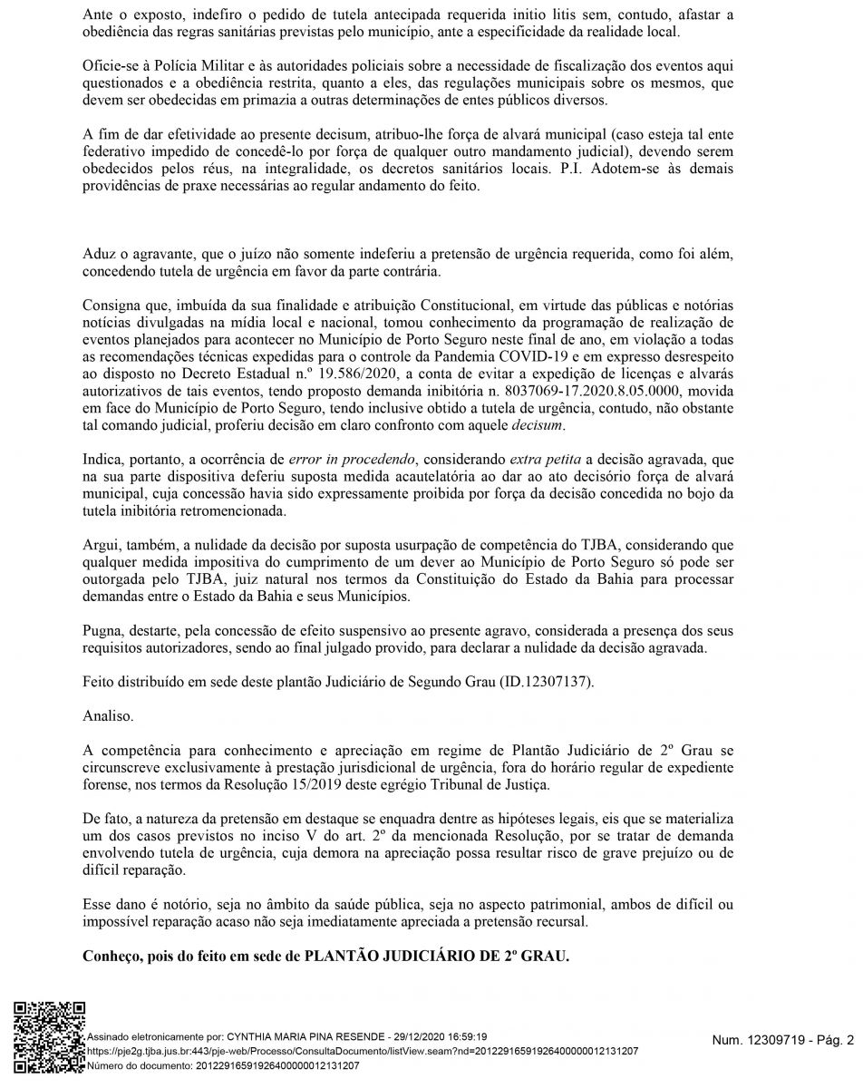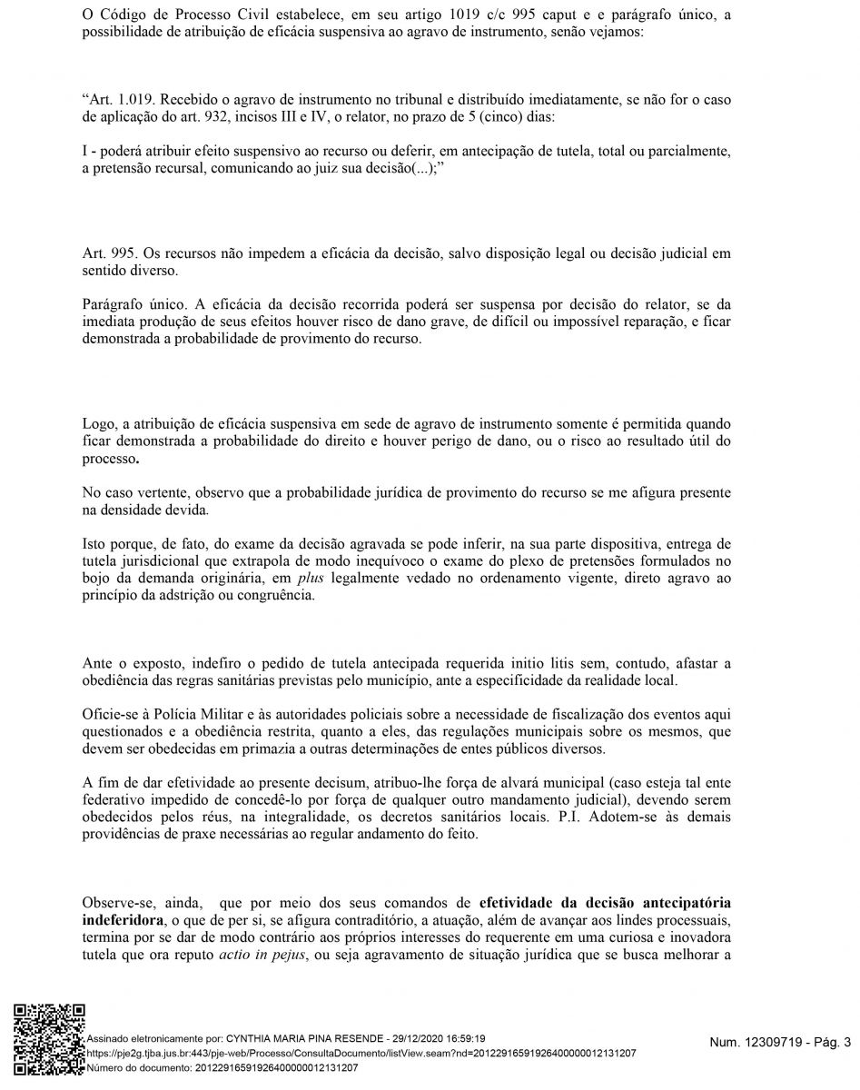 Na decisão que INDEFERIU, ou seja, NEGOU a decisão do Juiz Rogério Barbosa de Sousa e Silva, a Desembargadora Drª Cynthia Maria Pina Resende atende ao pedido do Governador Rui Costa. Desta forma, o decreto do município libera eventos com até 200 pessoas se torna nulo.