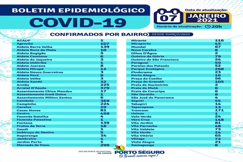 A prefeitura de Porto Seguro, através da Secretaria Municipal de Saúde, divulgou na noite desta quinta-feira 07/01, "Boletim Epidemiológico" com dados atualizado da Covid-19 na Terra Mãe do Brasil. De acordo com o boletim, Porto Seguro já registrou um total de 12.998 casos, dos quais 12.676 pacientes estão curado, 238 casos ativos, sendo que 231 pacientes em recuperação domiciliar e 07 internados e 84 óbtos.
