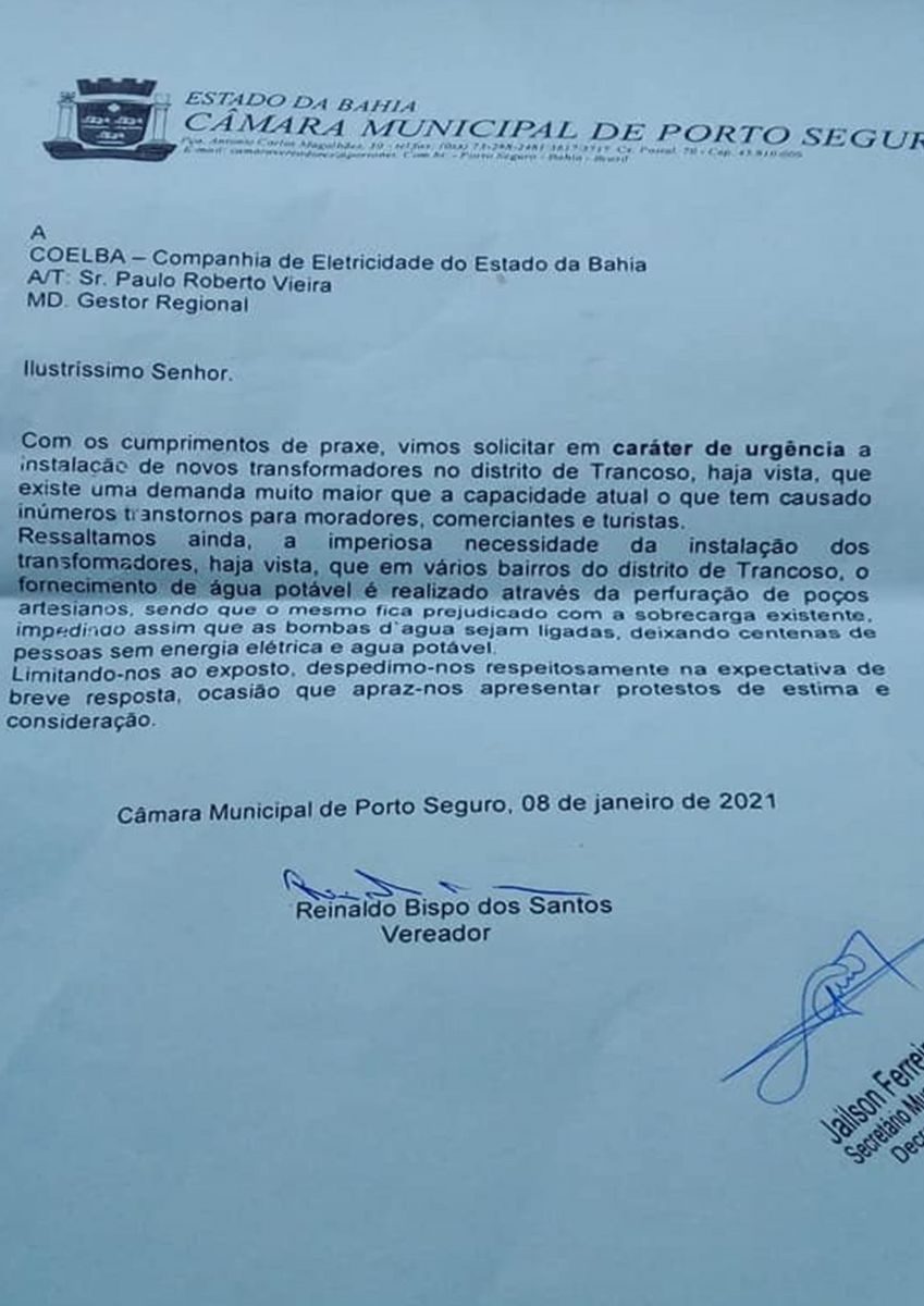 “Trancoso possui uma demanda muito maior que a capacidade atual oferecida pela Coelba. Dentro dos problemas transtornos causados por constantes faltas de energia, está falta de água, tendo em vista que grande parte do abastecimento de água é realizado através de poços artesianos, ou seja, a falta de energia causa o desabastecimento de água”, destacou o vereador Reinado Farofa.