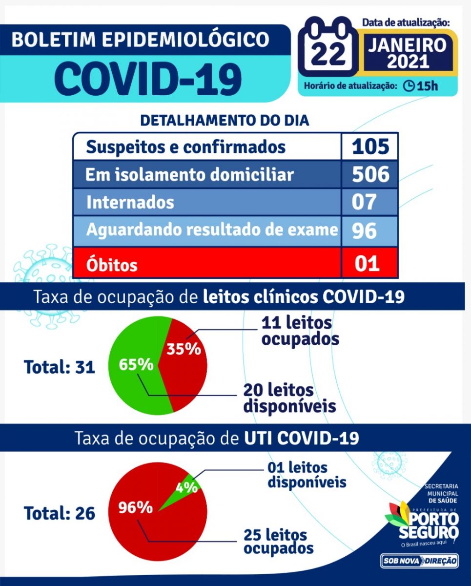 A Prefeitura de Porto Seguro, através da Secretaria Municipal de Saúde, informa que no período de 14/03/2020 a 22/01/2021, foram 13.930 casos de COVID-19, sendo 4.894 confirmados e 9.036 suspeitos, classificados de acordo com a sintomatologia clínica.