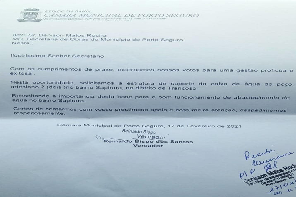 Nesta quarta-feira 17/02, o vereador Reinaldo Farofa esteve na Secretaria Municipal de obras para solicitar a instalação de estrutura para fixarção de Caixa d'Água do Poço Artesiano (poço 2) do Bairro SAPIRARA, Distrito de Trancoso. na Orla Sul de Porto Seguro. A obra visa oferecer o bom funcionamento do sistema de abastecimento de água na localidade.