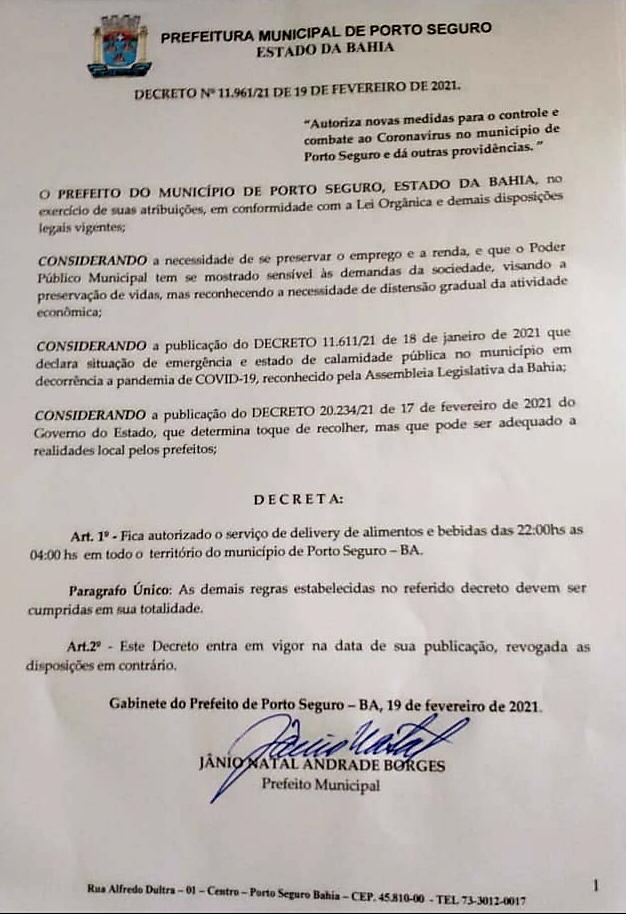 Com o objetivo de preservar o emprego e renda no município, o prefeito de Porto Seguro, Jânio Natal, autorizou o funcionamento dos serviços de delivery de alimentos e bebidas no horário das 22h às 4h durante o período do toque de recolher determinado pelo Governo do Estado da Bahia.