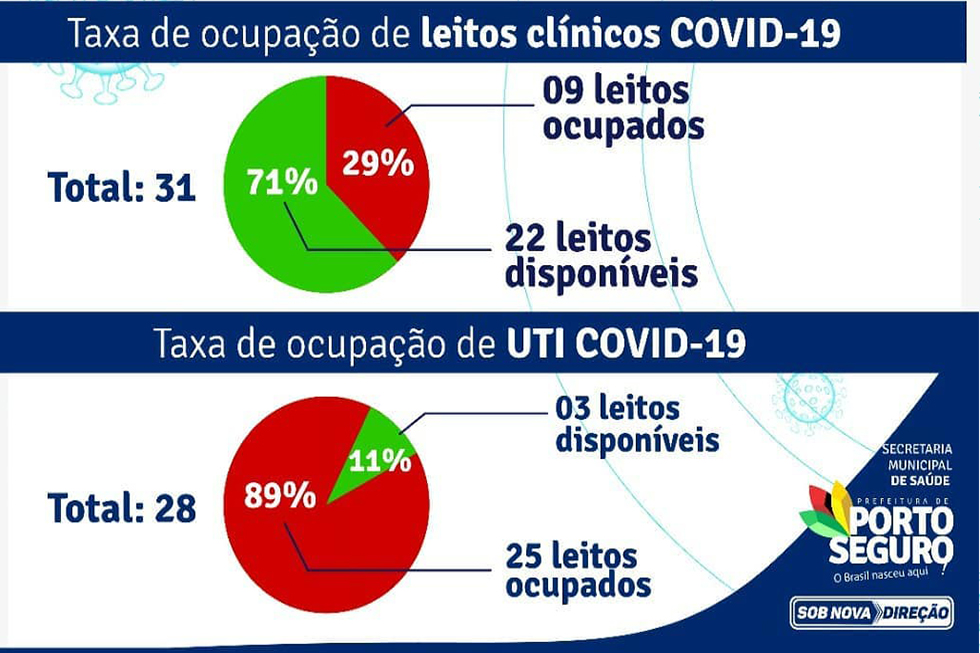 O município de Porto Seguro possui um total de 31 Leitos Clínicos (Covid-19), dos quais, 22 leitos estão disponíveis e 09 leitos oculpados. A cidade também possui 28 Leitos de UTI (Covid-19), dos quais 25 leitos oculpados e 03 leitos disponíveis.