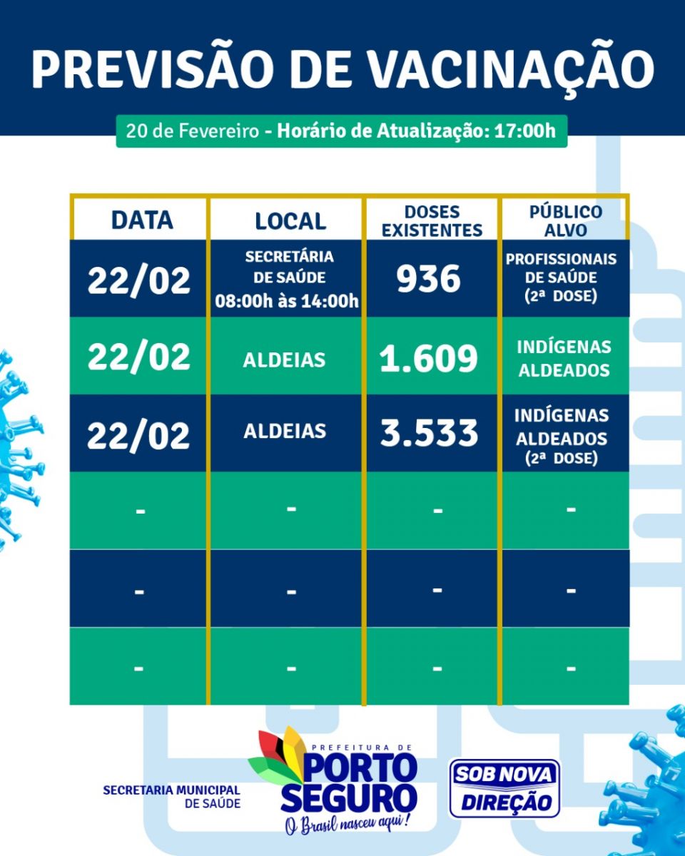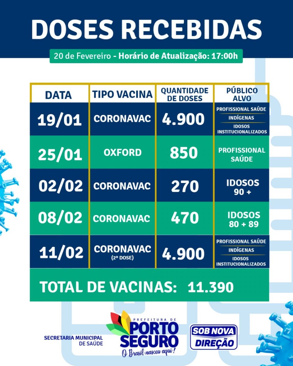 A Prefeitura de Porto Seguro, através da Secretaria Municipal de Saúde divulgou neste sábado 20/02, dados atualizados da vacinação contra a covid-19 na Terra mãe do Brasil.
