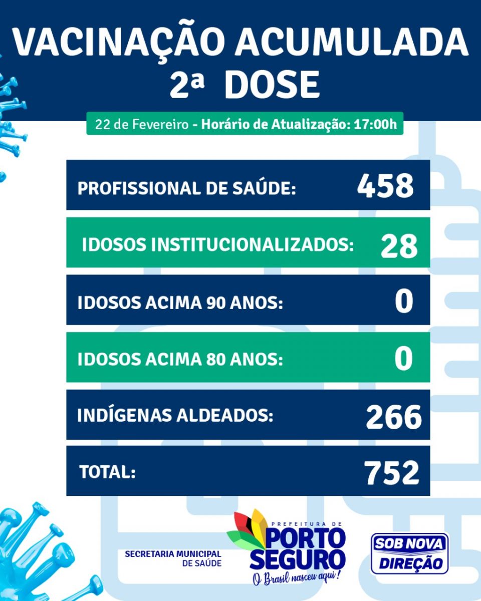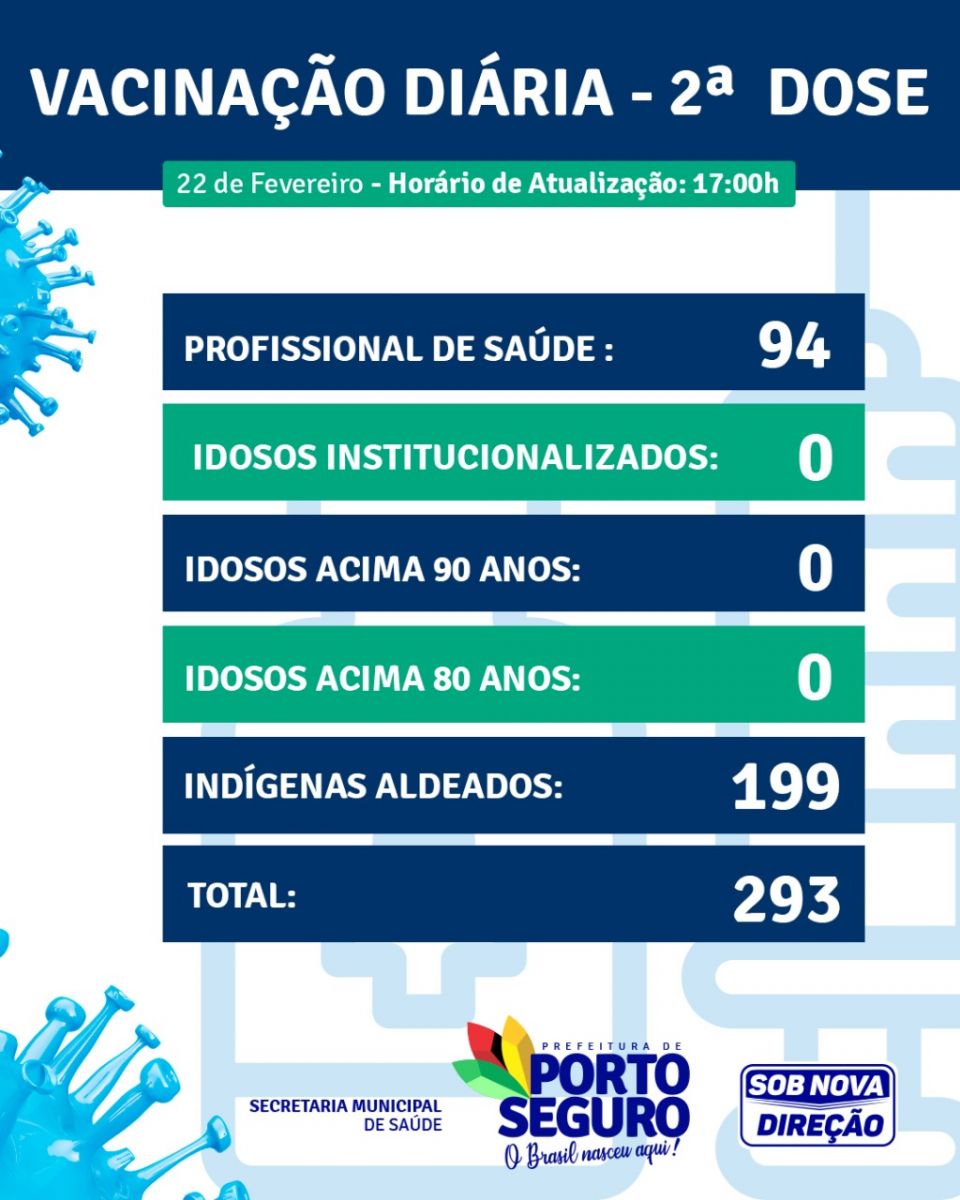 724 pessoas receberam a 2ª dose da vacina CORONAVAC, entre 458 profissionais de saúde, 266 indígenas aldeados até às 17h desta segunda-feira 22/02/21. Porto Seguro recebeu 4.900 doses da vacina Coronavac em 19/01/2021, dessas, 1.300 foram destinadas ao município, 3.600 para os indígenas aldeados.