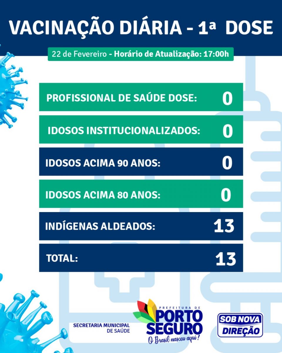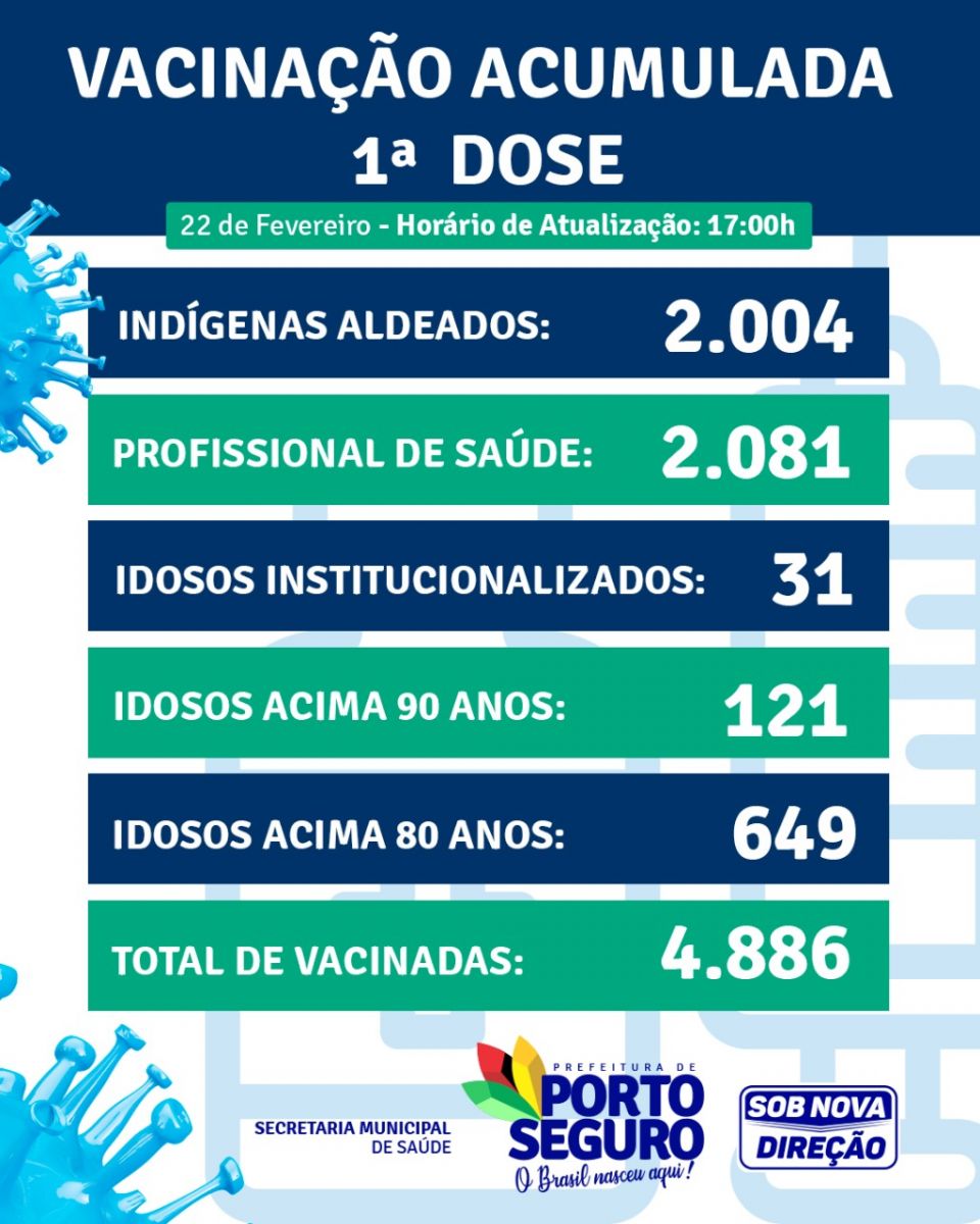 A Prefeitura de Porto Seguro, através da Secretaria Municipal da Saúde, disponibilizou na última segunda-feira 22/02, dados atualizado da vacinaçãocontra à Covid-19. Segundo informações, 4.886 pessoas já foram vacinadas com a 1ª dose da vacina contra a COVID-19 na Terra Mãe do Brasil, entre estes, 2.081 profissionais de saúde, 649 idosos acima de 80 anos, 121 acima de 90 anos, 31 idosos institucionalizados e 2.004 indígenas aldeados.