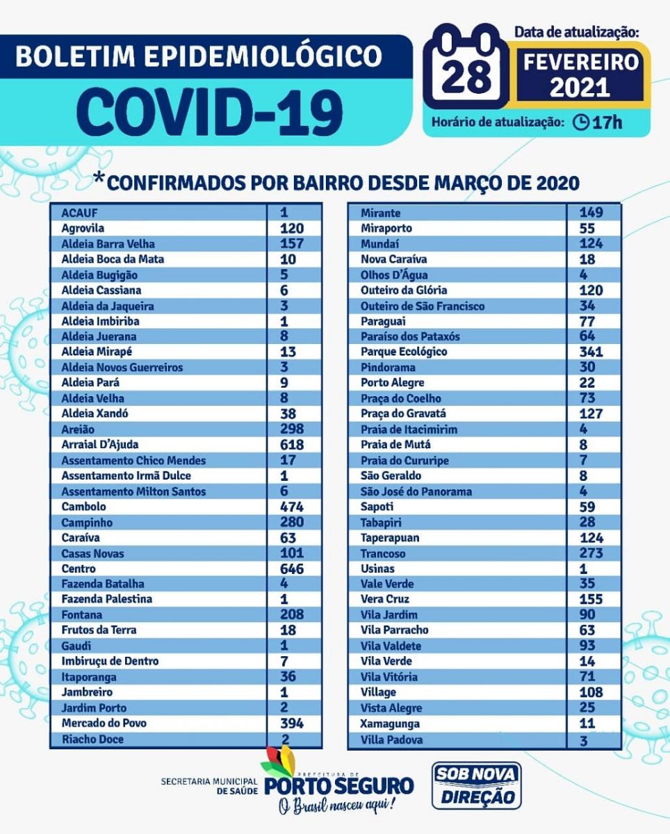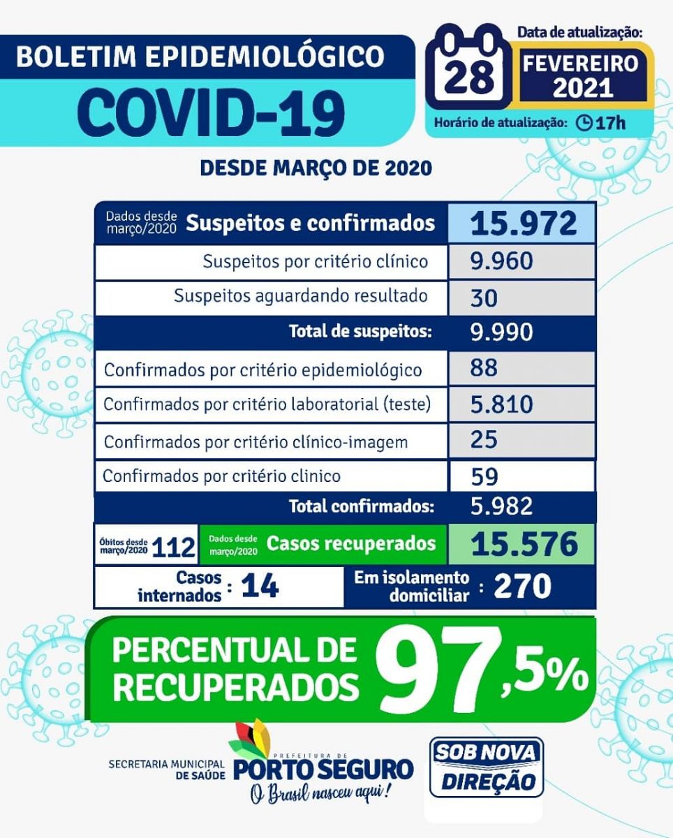 A Prefeitura de Porto Seguro, através da Secretaria Municipal de Saúde, informa que no período de 14/03/2020 a 28/02/2021, foram 15.972 casos de COVID-19, sendo 5.982 confirmados e 9.990 suspeitos, classificados de acordo com a sintomatologia clínica.