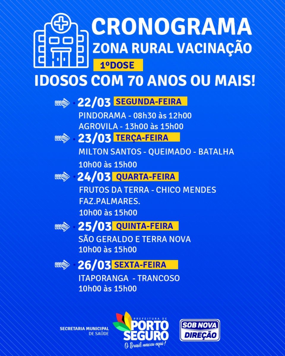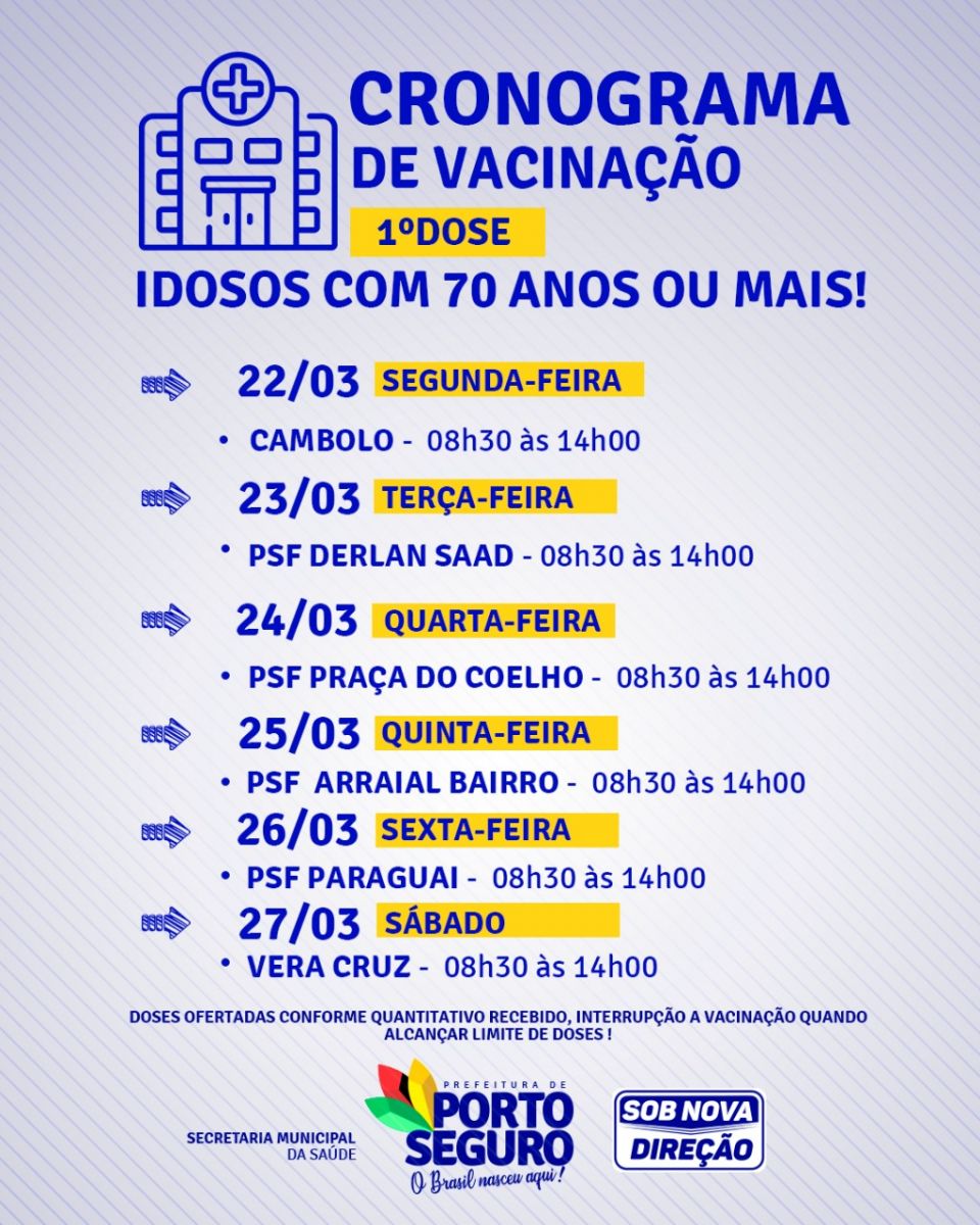 A prefeitura de Porto Seguro, através da Secretaria Municipal de Saúde, inicia nesta segunda-feira 22/03, vacinação para idosos a partir dos 70 anos. A ação acontece na sede, distritos e zona rural.
