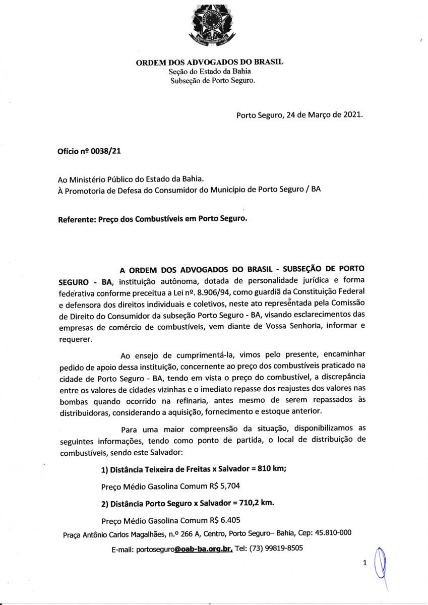 A OAB de Porto Seguro entrou com ação no Ministério Público pedindo investigação nos preços dos combustíveis na Terra Mãe do Brasil. Considerado um dos preços mais caros do país, a OAB solicita que seja comparado preços de cidade vizinhas, bem como, a não diminuição dos preços quando os mesmos caem na refinaria.