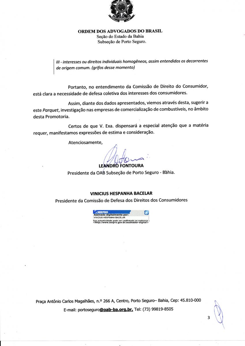 "O ofício foi emktido no mesmo na cidade de Eunápolis, ambos já foram assinados, na TERRA MÃE DO BRASIL, está sendo encaminhado ao Ministério Público através do Drº Vinicius Barcelar, presidente da comissão de Direitos do Consumidor da OAB Porto Seguro”.