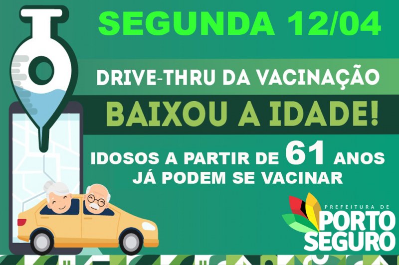 A prefeitura de Porto Seguro, através da Secretaria Municipal de Saúde, começa nesta segunda e terça-feira (12 e 13/04), vacinação para idosos a partir de 61 anos. Porto Seguro é a primeira cidade do Brasil a iniciar vacinação nesta faixa etária, isso devido às propriedades adotadas pelo governo Jânio Natal, com o apoio da secretária Drª Raíssa Soares.