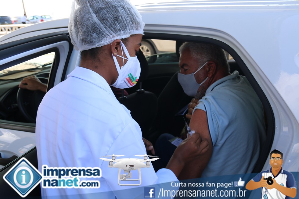 Para atender a meta da vacinação, a prefeitura de Porto Seguro montou duas megas estruturas, uma para atender aos idosos que chagavam ao mutirão em veículos, sendo atendidos via DRIVE THRU. Na segunda estrutura, uma grande tenda com profissionais da saúde e servidores voluntários faziam o atendimento e orientação aos idosos, os quais, eu outra tenda, aguardavam ‘sentados’ protegidos do sol, o momento de receber o imunizante.