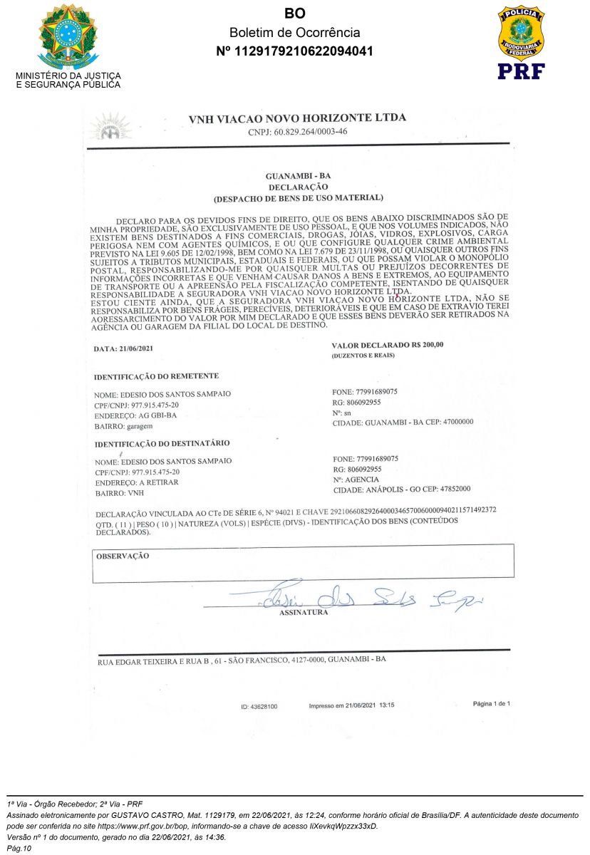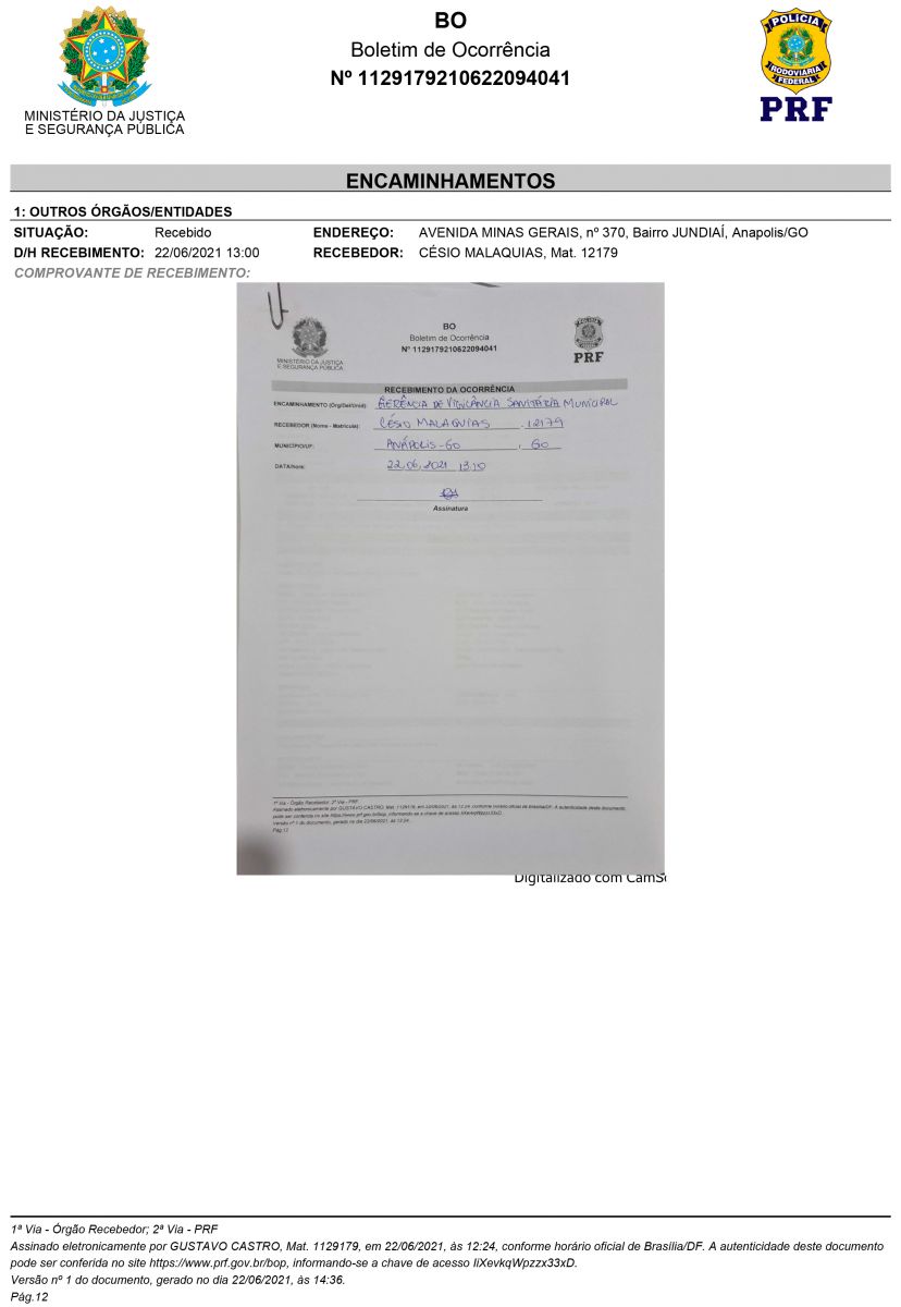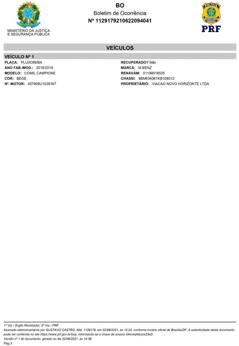Veja abaixo Boletim de Ocorrência da Polícia Rodoviária Fedrral de Goiais