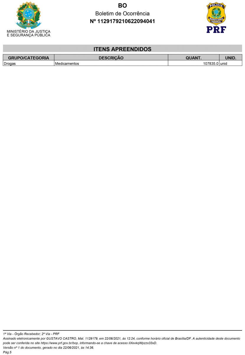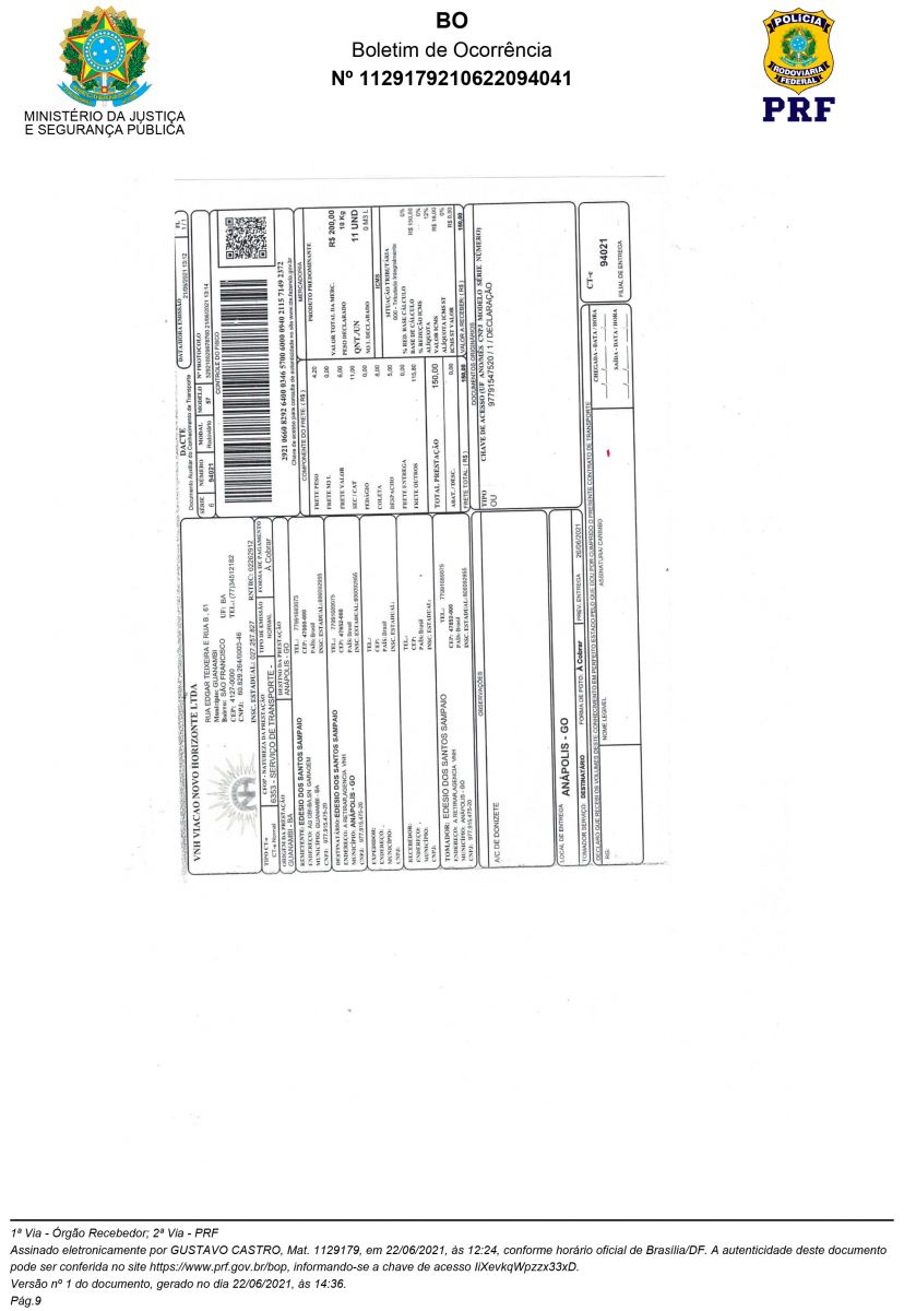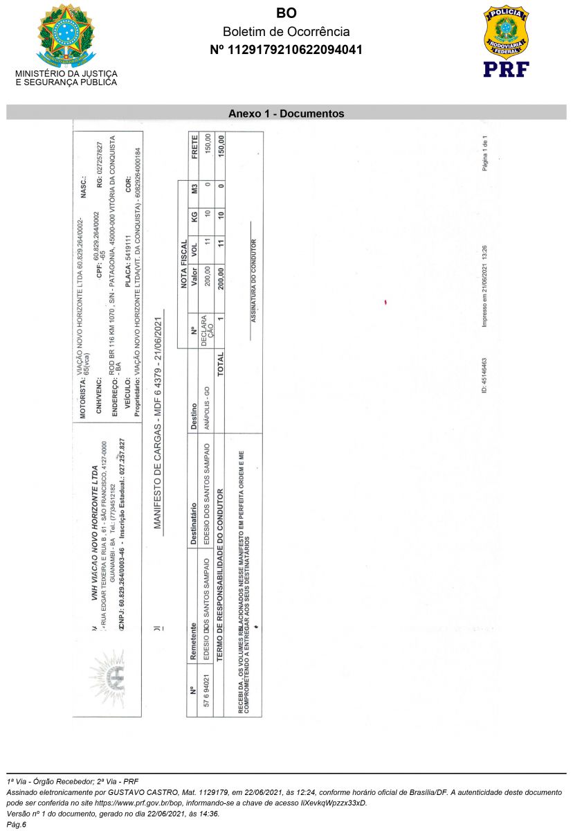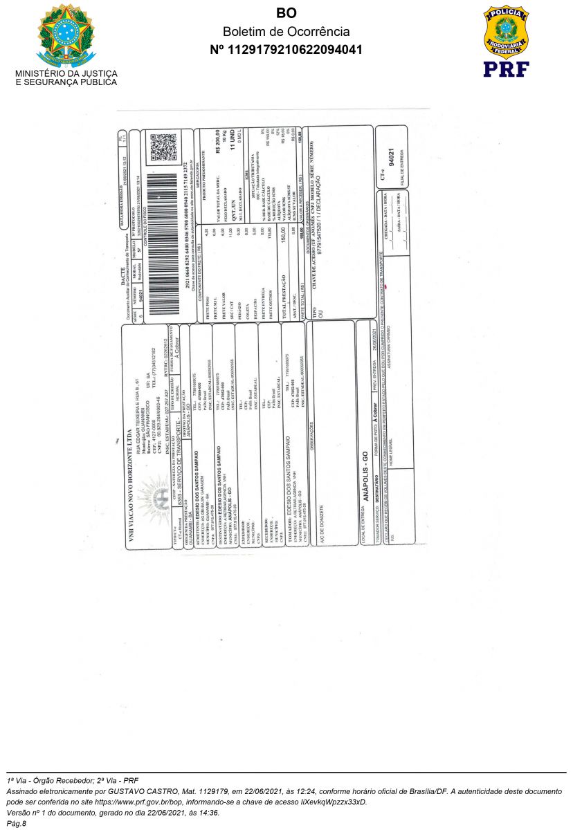 Veja abaixo Boletim de Ocorrência da Polícia Rodoviária Fedrral de Goiais