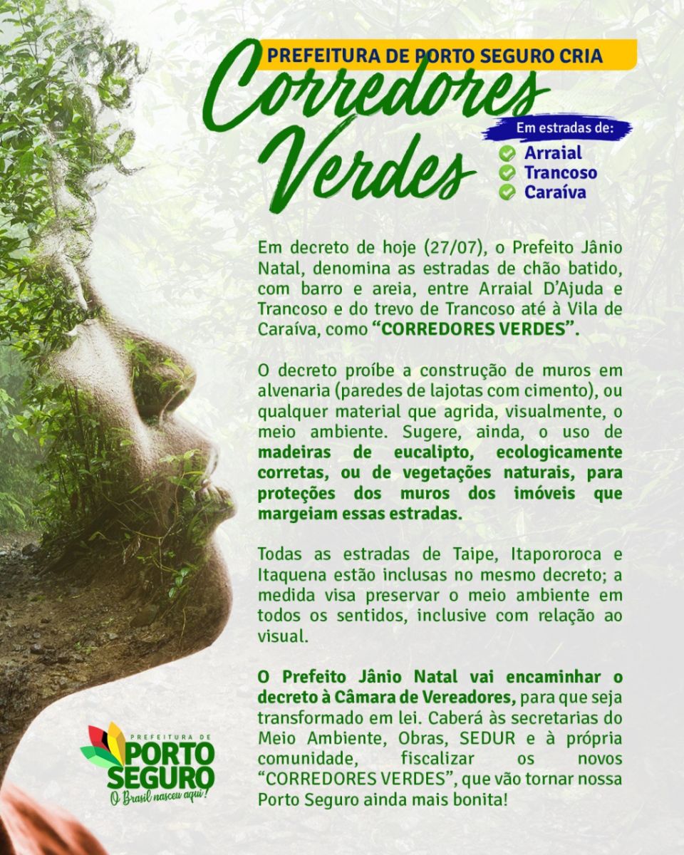 Em decreto publicado na última terça-feira 27/07, o Prefeito Jânio Natal, denomina as estradas de chão batido, com barro e areia, entre Arraial d'Ajuda e Trancoso, bem como do trevo de Trancoso até à Vila de Caraíva, Orla Sul de Porto Seguro, como "CORREDORES VERDES". O decreto proíbe a construção de muros em alvenaria (paredes de lajotas com cimento), ou qualquer material que agrida, visualmente, o meio ambiente. Sugere, ainda, o uso de madeiras de eucalipto, ecologicamente corretas, ou de vegetações naturais, para proteções dos muros dos imóveis que margeiam essas estradas.