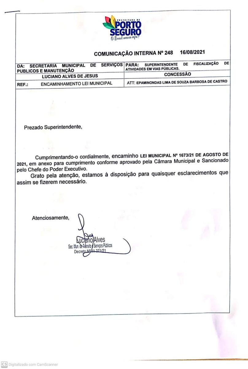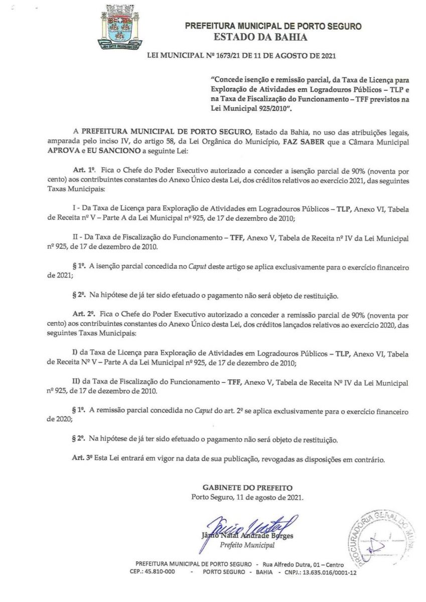 Cumprindo mais uma PROMESSA DE CAMPANHA, o prefeito Jânio Natal sancionou a Lei Municipal 1673/21 que concede desconto de 90% nós "Alvarás" de Exploração e Concessões em Logradouros Públicos no município de Porto Seguro. O desconto aprovado pela Câmara Municipal, é referente ao exército 2021, tem como justificativa, as problemáticas e impactos econômicos causados pela PANDEMIA da Covid-19.