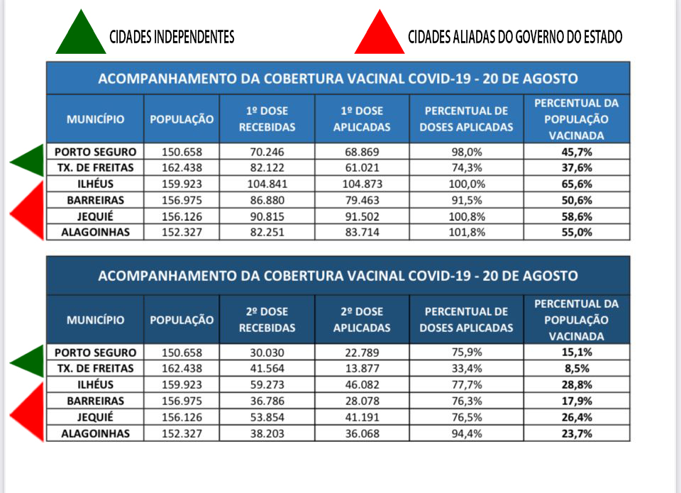 Abaixo podemos ver um quadro comparativo entre municípios com a mesma faixa populacional, Porto Seguro e Teixeira de Freitas, municípios que não fazem parte da base do governo estadual e os municípios de, Ilhéus, Barreiras Jequié e Alagoinhas, todos da base aliada do governo estado. Os números mostram que, tanto no envio de vacinas para 1ª, quanto no envio de vacinas para a 2ª dose, Porto Seguro e Teixeira de Freitas recebem um volume de vacina CONSIDERAVELMENTE menor que os demais municípios.