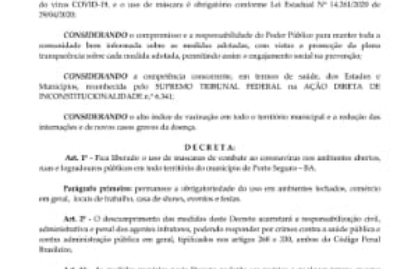 Otimista com o avanço da vacinação e a queda expressiva dos casos de covid no município, a Prefeitura de Porto Seguro emitiu decreto 13160/21, nesta segunda-feira, desobrigando o uso de máscaras de proteção contra o coronavírus em ambientes abertos, ruas e logradouros públicos.