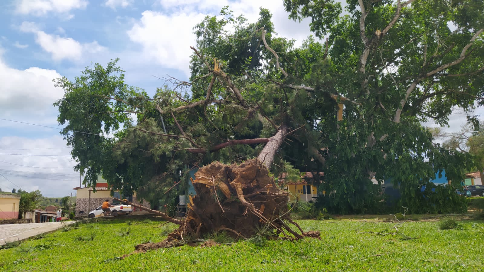 CAOS COMPLETO - O temporal com fortes ventos, chuvas e com a queda de granizo que atingiu o distrito de Monte Pascoal no último dia 29 de novembro, causou o destelhamento de residências; queda de árvores de grande porte sobre a rede elétrica e residências; interdição de ruas; destruição completa de algumas residências; e danos em prédios públicos.