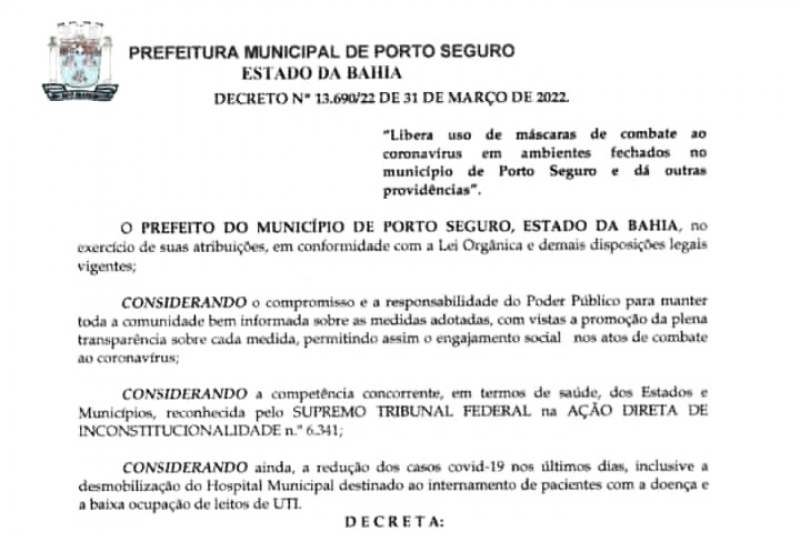 O Gabinete oficial da Prefeitura de Porto Seguro, no início da noite desta quinta-feira, 31, decidiu por desobrigar o uso de máscaras em ambientes fechados. A medida foi tomada, sobretuso pelo avanço da vacinação que gerou queda significativa de novos casos, de internações e óbitos.